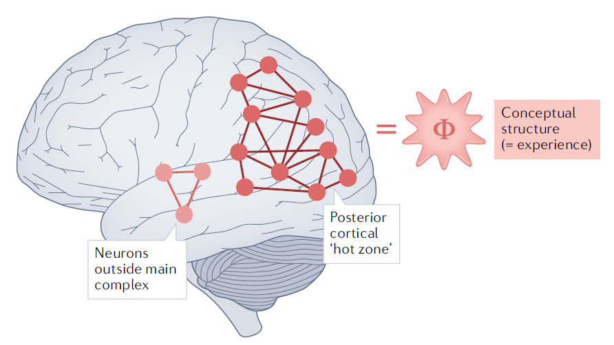 整合信息论(IIT)的出发点与HOT或GWT非常不同——它提出了一种数学方法来描述现象学的特征。该理论先提出了关于意识体验的现象学特征的公理(即,不证自明的、适用于所有可能形式的意识的属性),然后从这些公理推导出任何意识的物理底层所必须满足的属性。接着,IIT提出,将这些属性实例化的物理系统,必然也将意识实例化[57-60](见图3)。具体来说,IIT提出,应该将意识理解为“因果力量”(cause-effect power),与物理系统产生的整合信息(integrated information)的不可化约的最大值相关。反过来,整合信息与信息理论上的数量Φ有关,它衡量的是——广义上——一个系统作为一个整体(而不是独立考虑的各部分),产生多少信息。在IIT中,意识是一个系统的内在的、基本的属性,它既由组成该系统的因果机制的性质决定,也由这些机制的状态决定[60]。与HOT和GWT相反,IIT主要将意识和后部皮层区域(所谓的“后部热区”,包括顶叶、颞叶和枕叶区域)联系起来。部分原因是,据说,这些区域表现出的神经解剖学特性,很适合产生高层次的整合信息[59]。GWT和HOT(在功能层面)将意识与皮层信息处理的各个方面联系起来。与它们不同,IIT并不是指“信息处理”本身,而是将意识与一个系统的内在因果结构(即一个系统影响自身的因果能力)的属性联系起来。根据IIT,任何能产生最大值非零的(不可化约的)整合信息的系统,至少在某种程度上,都是有意识的。因此,IIT似乎意味着,有意识的非生物系统已经存在[61]。IIT是相当全面的理论,对意识的全局状态和局部状态都提供了说明 [59](见图3)。全局状态与系统产生的不可化约的整合信息量有关,用Φ来衡量。因此,IIT赞成用单维概念来把握全局状态,因为它把一个有机体的意识水平等同于它的Φ值。而局部状态的体验特征,可以用“概念结构”(conceptual structures)来理解,IIT将其视为高维空间中的“形状”,由系统的机械性因果结构所规定。这些形状产生了(或者说等同于)特定种类的现象特征。例如,视觉体验的空间性质,与早期视觉皮层中的网状机制所规定的因果结构有关[62]。意识的全局统一性是从整合信息的整合角度来解释的——整体产生的信息超过了各个部分产生的信息。最后,当且仅当内容被纳入一个因果“复合体”中,内容才是有意识的(否则则是无意识的)。这儿的复合体是物理系统的一个子集,支撑了最大的不可化约的整合信息。图3:整合信息论。整合信息论(IIT)的核心主张是,意识与物理系统的因果结构是相同的,规定了不可化约的整合信息的最大值。意识的内容与因果结构的形式有关,而意识的水平则与因果结构的不可化约性有关,可用数字Φ来衡量[59]。在解剖学上,IIT与后部皮层的“热区”有关。要对这一核心主张进行实证评估很有挑战性,主要是因为,对Φ的测量是不可行的(除了对某些简单的模型系统)。目前,人们已经开发了各种Φ的替代指标[157],有的指标看起来很有前景。其中,最令人瞩目的是扰动复杂指数(perturbational complexity index,PCI),它测量的是大脑对经颅磁刺激的反应的算法复杂度(Lempel-Ziv)[158]。重要的是,PCI,在跟踪有神经系统损伤的病人的全局意识状态方面,具有诊断和预后价值[158]。然而,PCI并不等同于Φ,而且PCI值与全局意识状态之间的相关性与其它意识理论并不矛盾。一些心理物理学研究间接支持了IIT,证据表明,视觉皮层内侧向连接强度的局部变化,可以改变视觉空间的结构[116],而全局状态的变化,则与后部皮层区域功能多样性和整合能力的降低有关[159]。不过,有证据表明,前部皮层区域的活动是知觉意识所必须的,这将对IIT构成挑战。