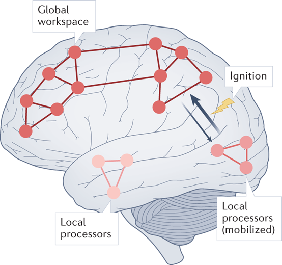 | 点火并广播到神经元全局工作空间的信息进入意识,额叶与顶叶承担中心枢纽般的作用 | |