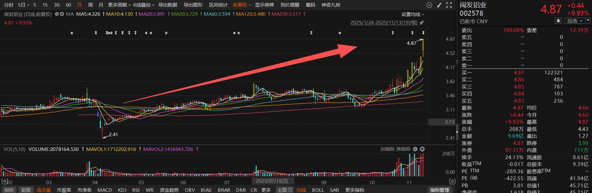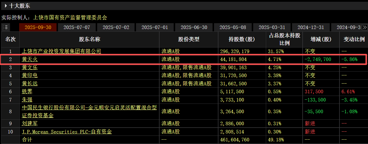 【8天4板闽发铝业:第二大股东黄天火10月14日-11月13日累计减持938.15万股】财联社11月13日电,闽发铝业(002578.SZ)公告称,股东黄天火已完成股份减持计划,10月14日-11月13日累计减持938.15万股,占公司总股本的0.9995%。减持价格区间为3.54元/股至4.68元/股。减持后,黄天火持有公司股份3480.03万股,占总股本的3.71%。小财注:截至三季度末,黄天火位列闽发铝业第二大股东,持股4418.18万股,占总股本的4.71%。闽发铝业9月12日公告,黄天火计划自2025年10月14日至2026年1月13日以集中竞价方式减持公司股份不超过938.63万股,占公司总股本的1%。二级市场上,闽发铝业自4月9日低点迄今股价累计最大涨幅达102%。