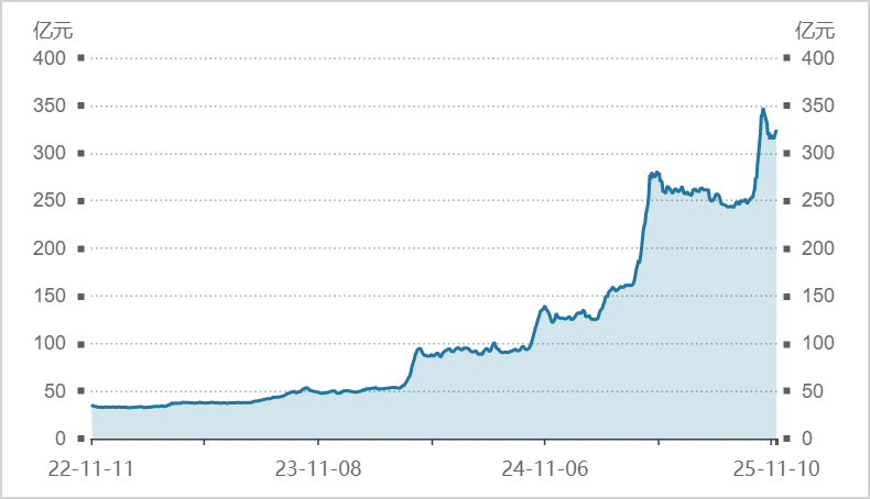 其中,截至11月12日,黄金ETF(159934,联接基金A/C:000307/002963)流通规模高达332.46亿元,较2024年3月飙升五倍之多,成为全市场流动性较好的主力基金之一。