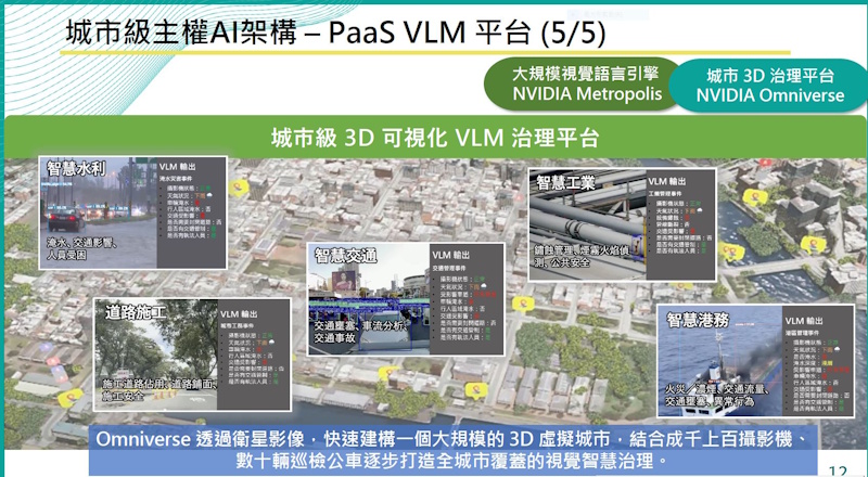 至於PaaS層,資訊處整合跨局處、跨領域的影像資料,使用Nvidia的商用VLM模型,結合影像資料來進行模型微調,並將其打造為共用的PaaS平臺,讓各局處都能使用,各自基於業務需要發展SaaS層應用。