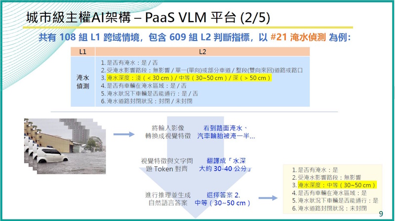 以道路淹水為例,相關單位例可能想進一步了解現場淹水的深度,因此團隊先了解需要,再將淹水深度分為淺度(低於30公分)、中度(30至50公分)、深度(高於50公分)三個等級,再以人工標註影像特徵及描述,來訓練VLM從影像畫面判斷淹水深度等級。