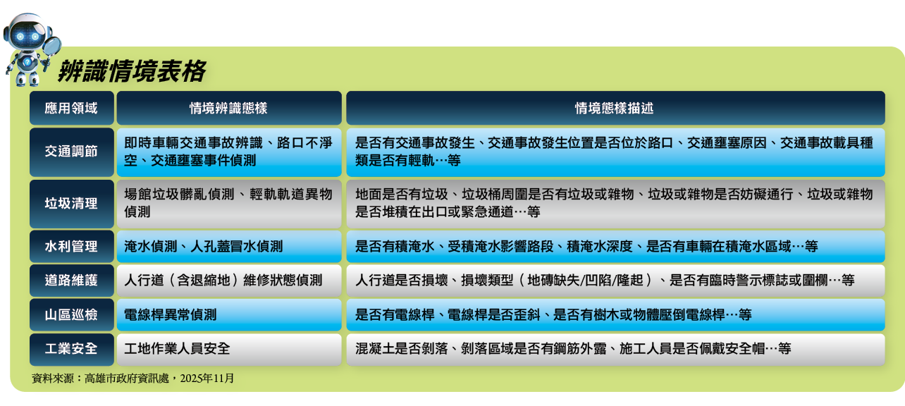 VLM可從城市的影像資料辨別108種情境,並且能判斷609組指標,相當於打造非常懂高雄在地城市治理情境的AI大腦。