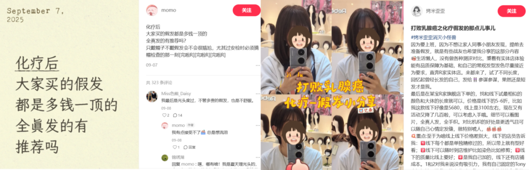 社媒平台关于化疗假发相关讨论内容 图片来源:小红书平台