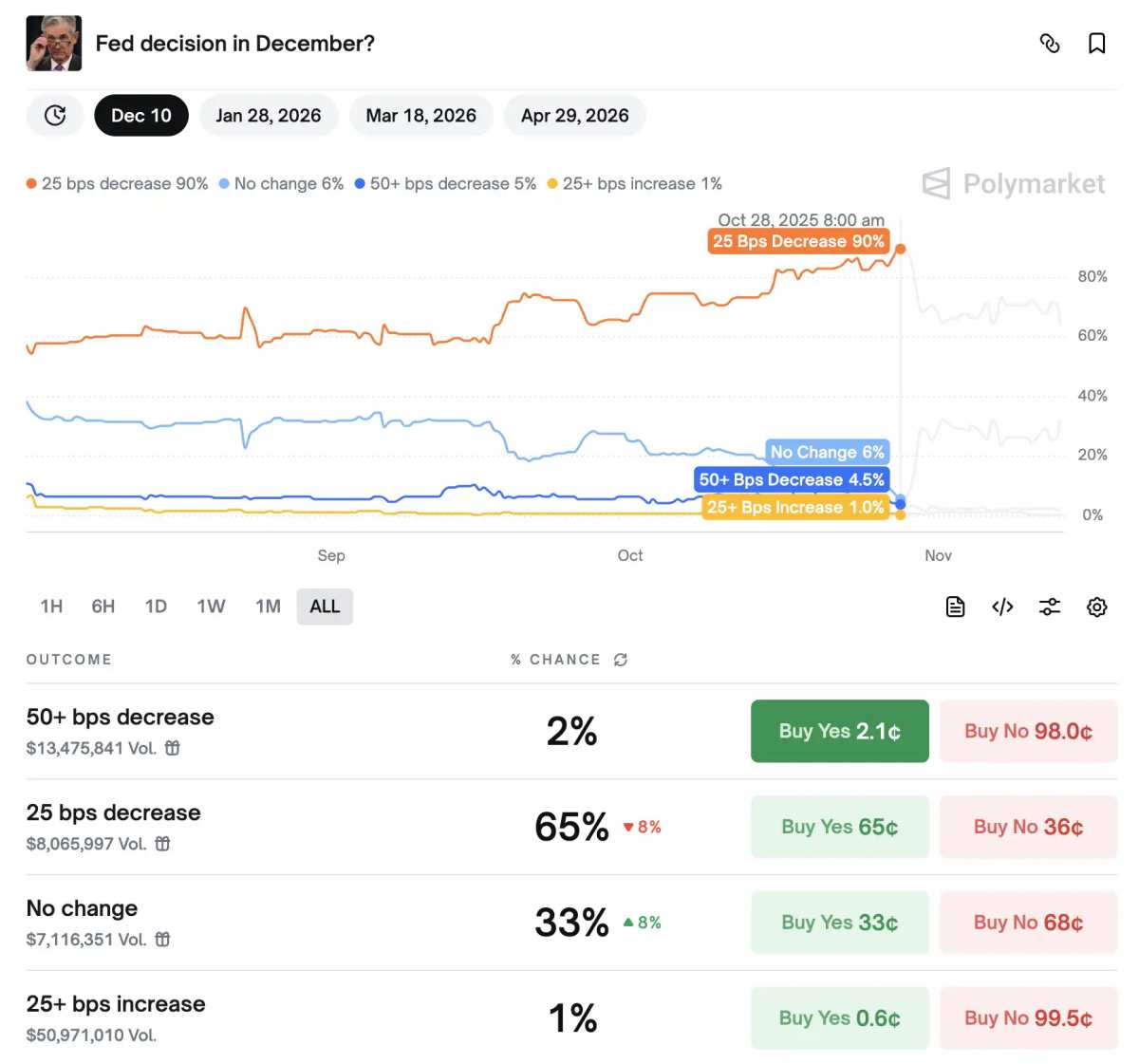 原本有 90% 胜率的 12 月 10 日美联储会议降息,目前在 Polymarket 上已经下降到了 65%。