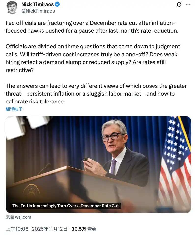 美联储官员对 12 月降息产生分歧越来越大,此前专注通胀问题的鹰派人士在上月降息后,开始主张暂停行动,官员们在三个判断性问题上存在分歧:
