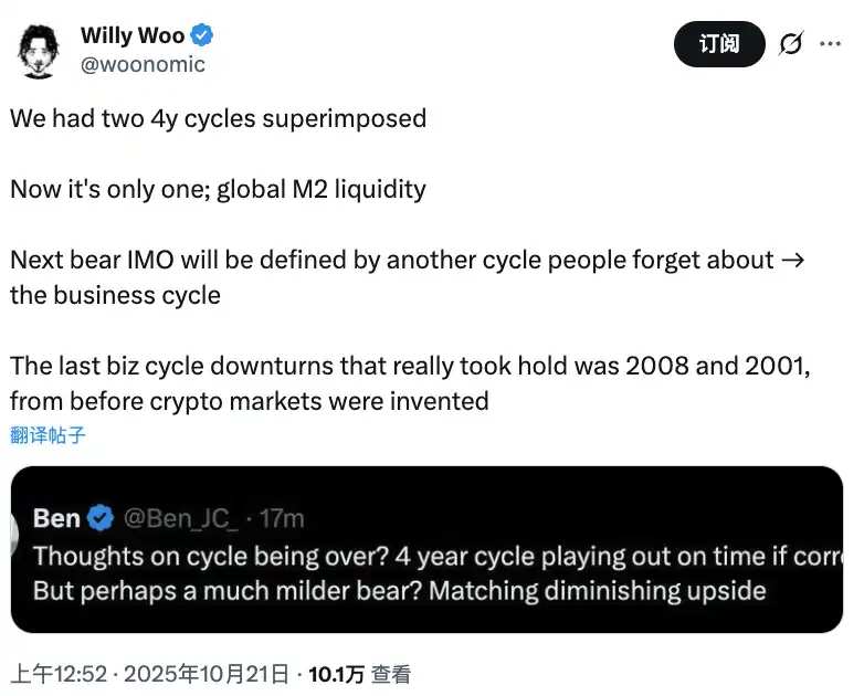 因此 Willy Woo 暗示:过去那个由双周期共振推动的牛市时代已经结束,比特币失去了过去那种「天然加速器」,上涨的驱动可能会更弱,也更依赖外部环境,而比特币目前的走势可能已经在提前告诉我们「顶部已至」。