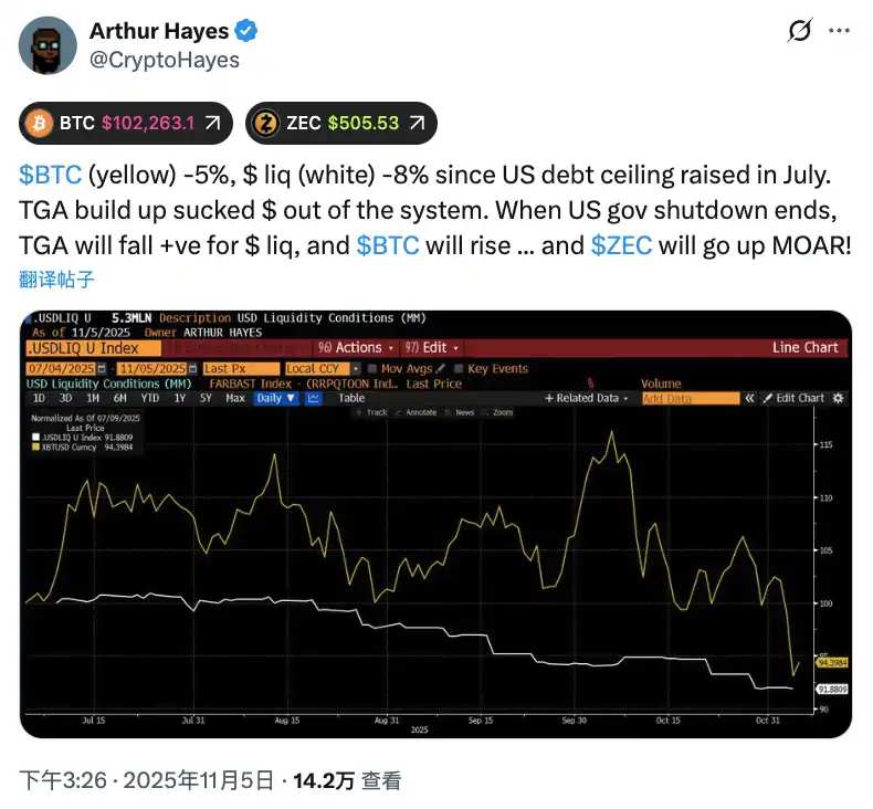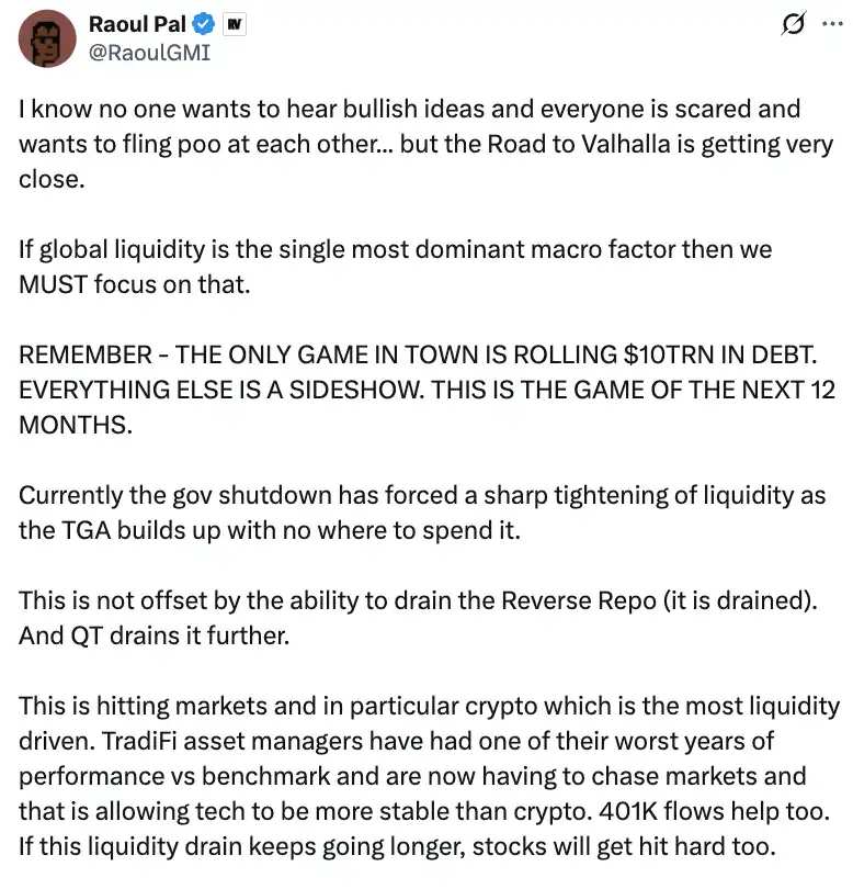 BitMEX 联合创始人 Arthur Hayes 也呼应了类似的情绪。他将比特币的下跌与自 7 月以来美元流动性下降 8% 联系起来,认为一旦财政部余额在停摆后下降,美元流动性将反弹,推动 BTC 走高。