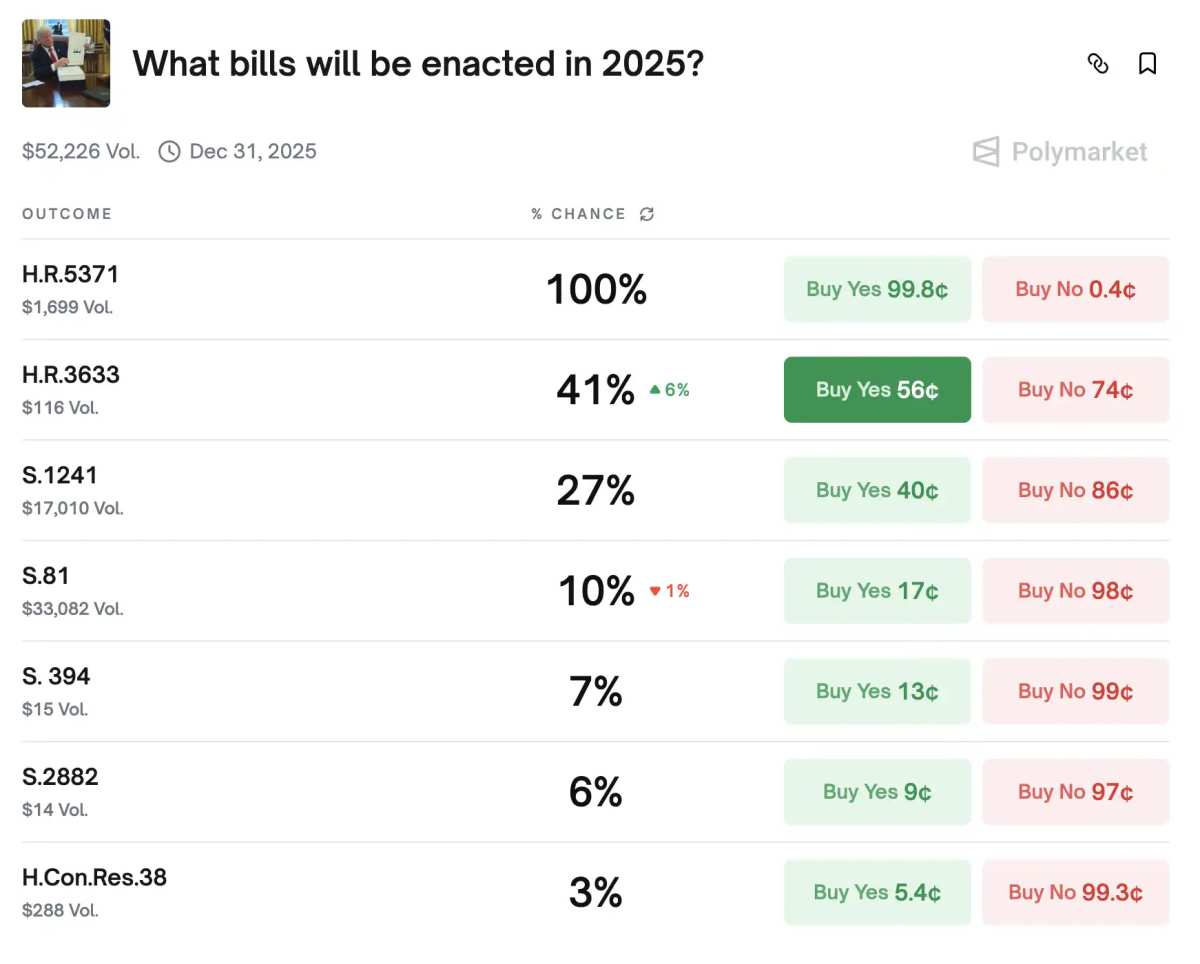 目前 polymarket 上「2025 年将颁布哪些法案?」市场中 CLARITY 法案 (H.R.3633) 通过的概率为 41%