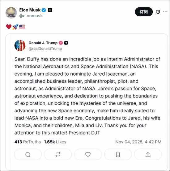 另一个政治上的关键事件是特朗普正在修复曾经的盟友。信号是 11 月 4 日,特朗普宣布再次提名马斯克的好友艾萨克曼出任 NASA 局长。