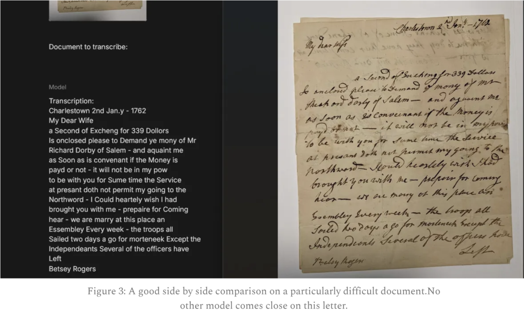 因此,Humphries选择了让大模型来识别历史手写体,他认为这是检验大模型整体能力的一个黄金测试。