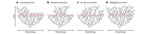 二叠纪-三叠纪大灭绝期间六个分支的灭绝者、幸存者和新出现者的形态变化。黄色为新出现者,红色为灭绝者,绿色为幸存者。