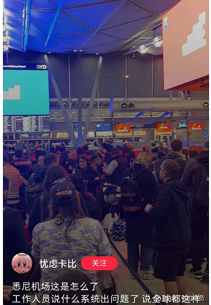 7月19日,美国,澳大利亚超市的收银台无法结账,同时机场显示屏失灵,导致乘客排起了长长的队伍。银行APP也打不开了。