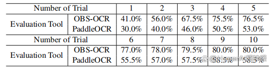 在多轮解密评估中,OBS-OCR 在多次尝试中的成功率逐渐提高,指标从 41.0% 的成功率不断提升到 80.0%,如下图所示。