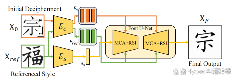 如下图所示,该零样本学习方法基于一个通用字体风格转换框架,通过双编码器系统,使源字体图像 X0 的样式适应目标样式 Xref,同时保留内容完整性。风格编码器 Es 从 Xref 提取样式特征 es,而内容编码器 Ec 处理 Xo 和 Xref 以获得多尺度内容特征 Fo,并通过具有多尺度内容聚合 (MCA) 和参考结构的 Font U-Net 进行精炼。训练完成后,即可直接使用零样本学习模块对扩散模型生成的结果进行优化。