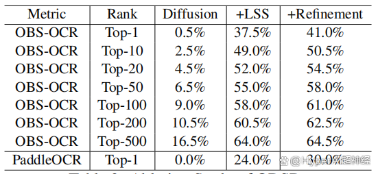 通过引入 LSS 模块,OBS-OCR 的识别准确率提高到了 37.5%,PaddleOCR 提高到了 24%。通过将零样本学习模块与 LSS 配合使用,可进一步提高 OBS-OCR 和 PaddleOCR 的 Top-1 准确性,分别额外增加了 3.5% 和 6%。