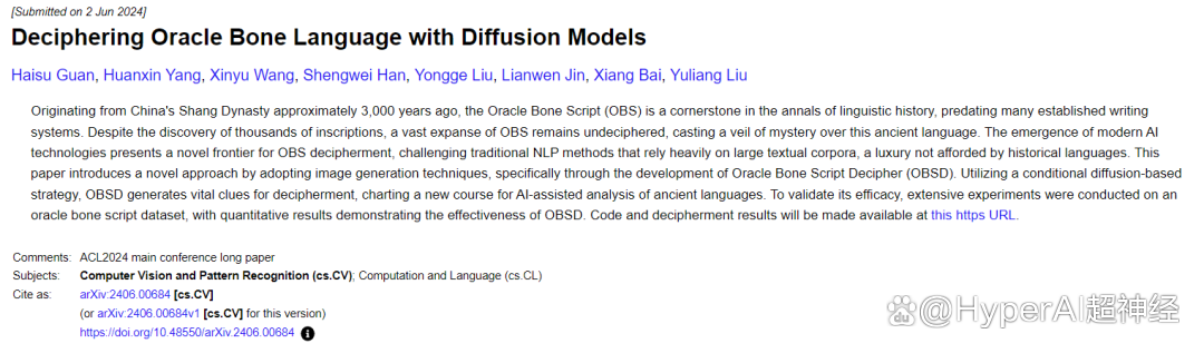 相关研究以「Deciphering Oracle Bone Language with Diffusion Models」为题,已被 ACL 2024 主会接收。