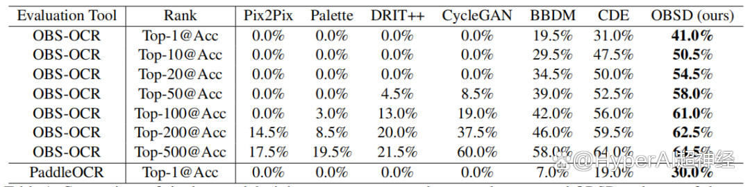 OSBD 通过 OBS-OCR 和 PaddleOCR 实现的 top-1 准确率分别为 41.0% 和 30.0%,表现相较于其他方法更优。随着排名的提高,准确度有明显的改善趋势,在 top-500 准确率下,OSBD 达到了 64.5% 的 OBS-OCR 识别准确率。
