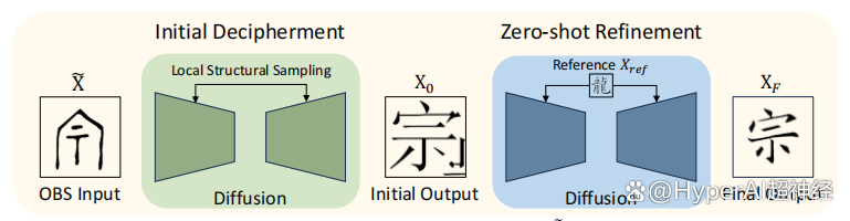 首先,通过对甲骨文图像 X 进行条件扩散以逼近初始图像 X0,然后通过零样本学习方法对其进行改进,并且利用 Xref 作为参考来纠正和增强结构。受益于改进过程中对文字结构的洞察,最终生成了对标现代汉字的文字结果 XF。