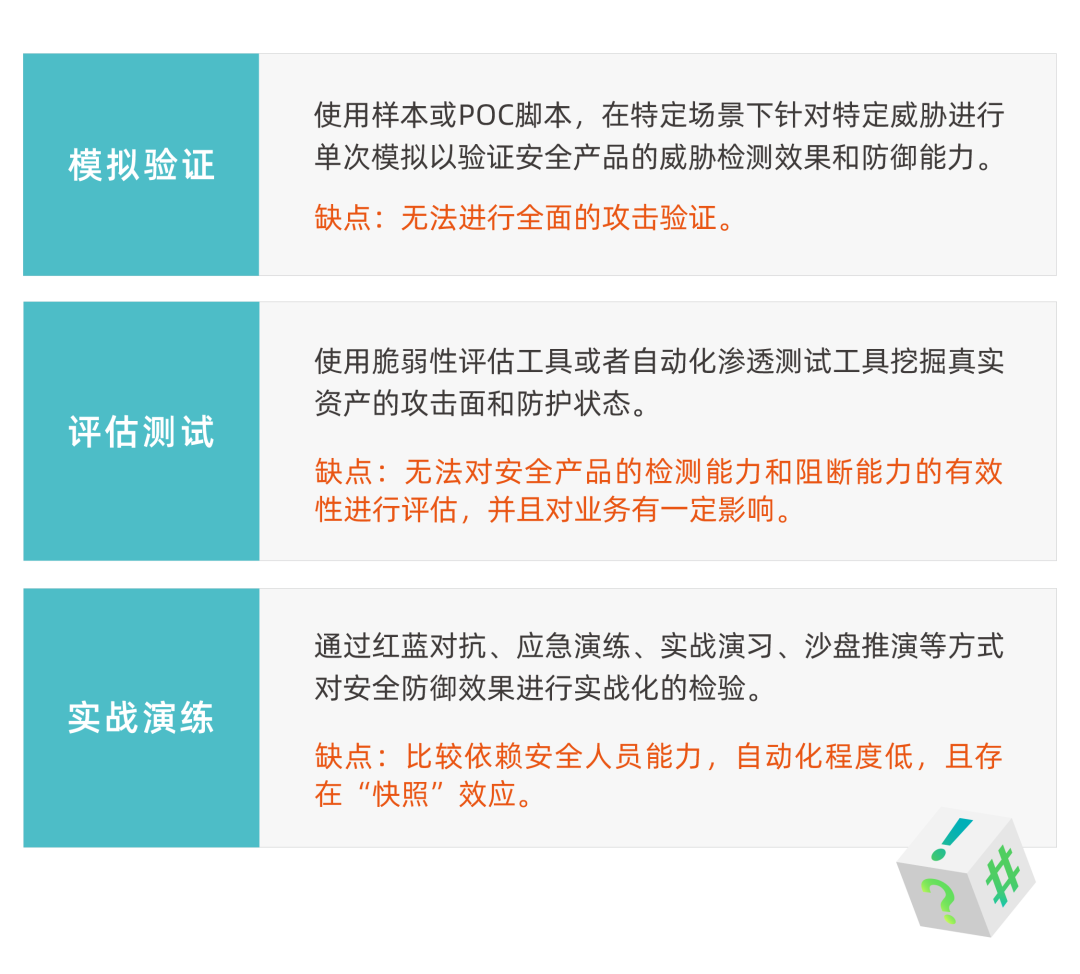 通常企业为了验证安全产品和防御措施有效性,往往会根据业务系统重要性和资源情况采取不同的方式进行周期性验证,但都各有利弊。