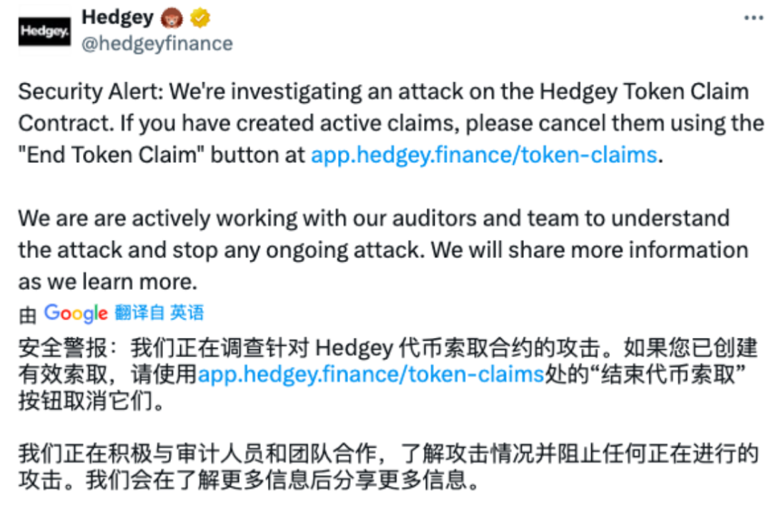 2024 年 4 月 19 日,Hedgey Finance 因合约漏洞遭攻击,共计损失约 4470 万美元,大部分的损失发生在 Arbitrum 网络上。