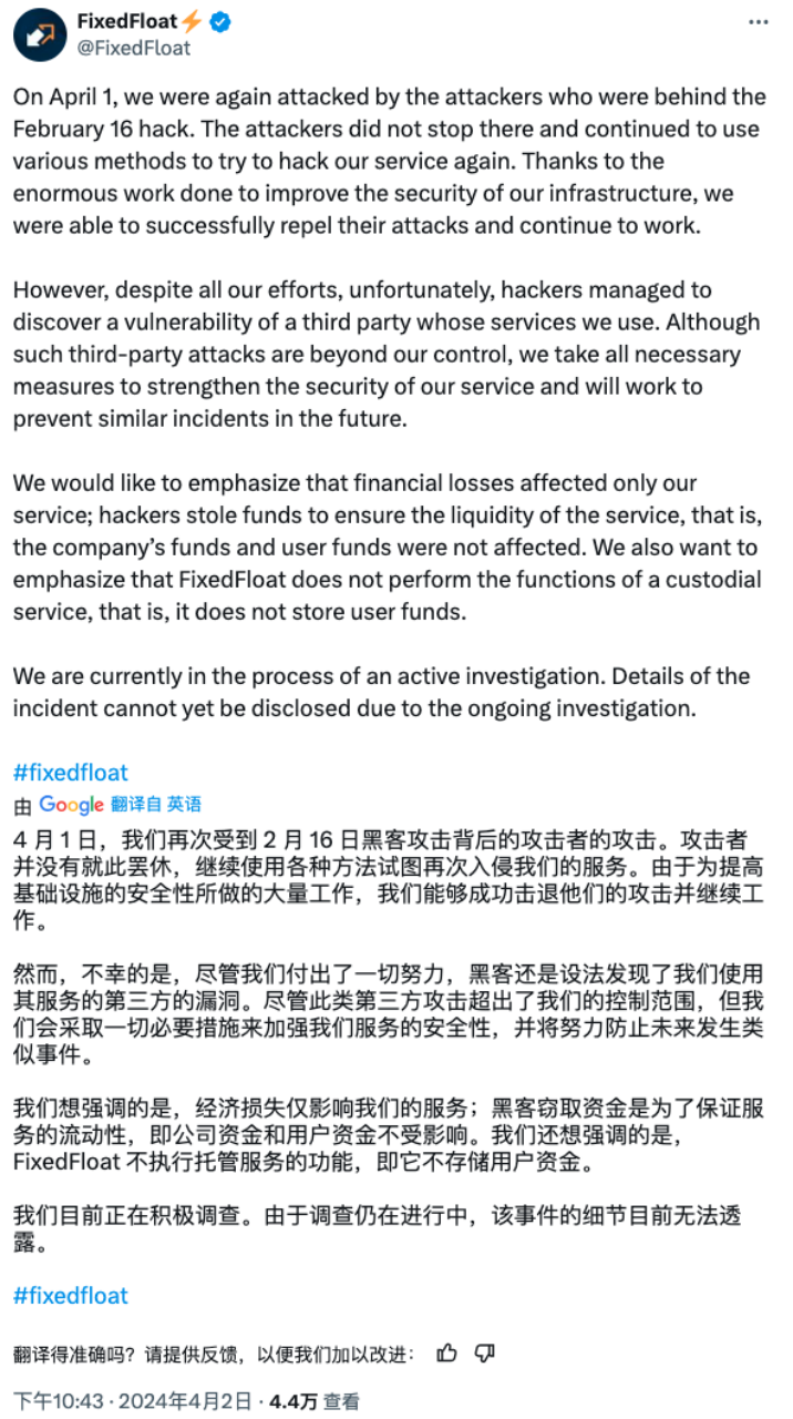 2024 年 4 月 2 日,去中心化交易所 FixedFloat 遭攻击,损失约 300 万美元。攻击者利用了 FixedFloat 第三方服务中的漏洞发起攻击,FixedFloat 表示公司和用户资金未受此次攻击的影响。
