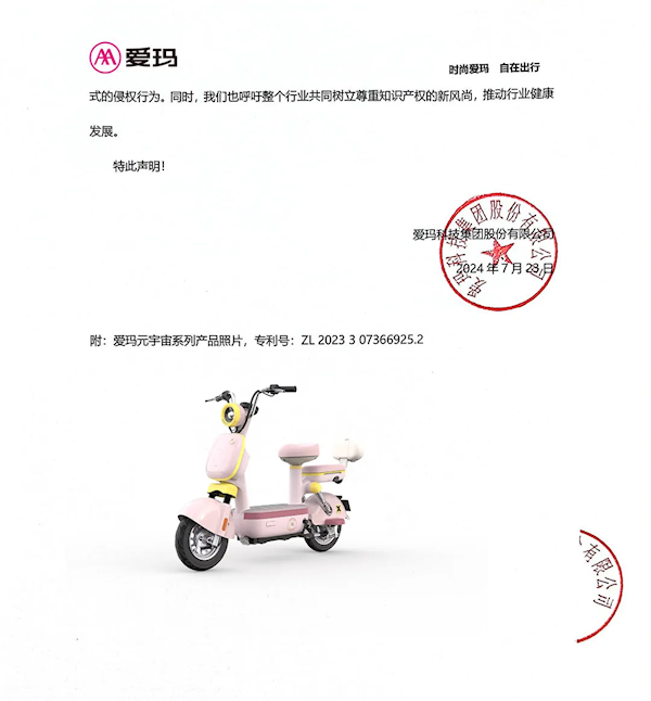 爱玛电动车发布声明,针对近期市场上出现大量仿冒其元宇宙系列产品的现象,严厉谴责了侵犯其知识产权的行为,并表示将采取法律手段维护自身权益。声明中强调了爱玛公司对知识产权的重视,并呼吁消费者通过正规渠道购买产品,避免购买到仿冒产品。