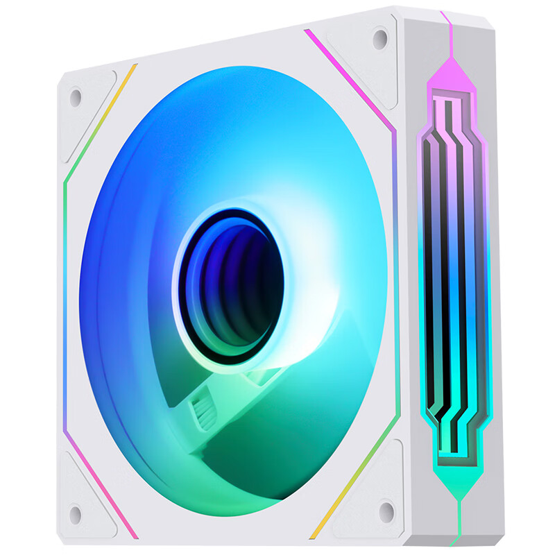 该风扇采用市面近来流行的轴心 + 侧面双无限镜设计,支持 5V ARGB 神光同步,可打造“无限隧道”的灯光效果。