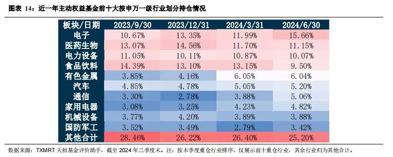 据天相投顾统计,按申万一级行业划分,全市场主动权益基金二季度重仓前十行业持仓占其股票比例合计74.80%,分别为电子、医药生物、电力设备、食品饮料、有色金属、汽车、通信、家用电器、机械设备、国防军工。其中,电子已连续第二个季度为基金第一大持仓行业,环比提升3.67个百分点。