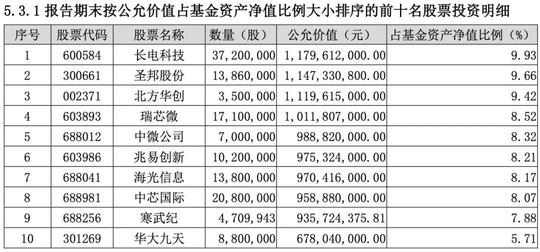 比如,银河创新成长二季度主要投资方向为硬科技领域,期间减持计算机板块,进一步增持半导体板块。最新前十大重仓股中,除了一只计算机软件个股,大部分为电子行业个股。半导体板块的长电科技、圣邦股份、兆易创新、中芯国际、中微公司、寒武纪-U,元件板块的北方华创、海光信息。