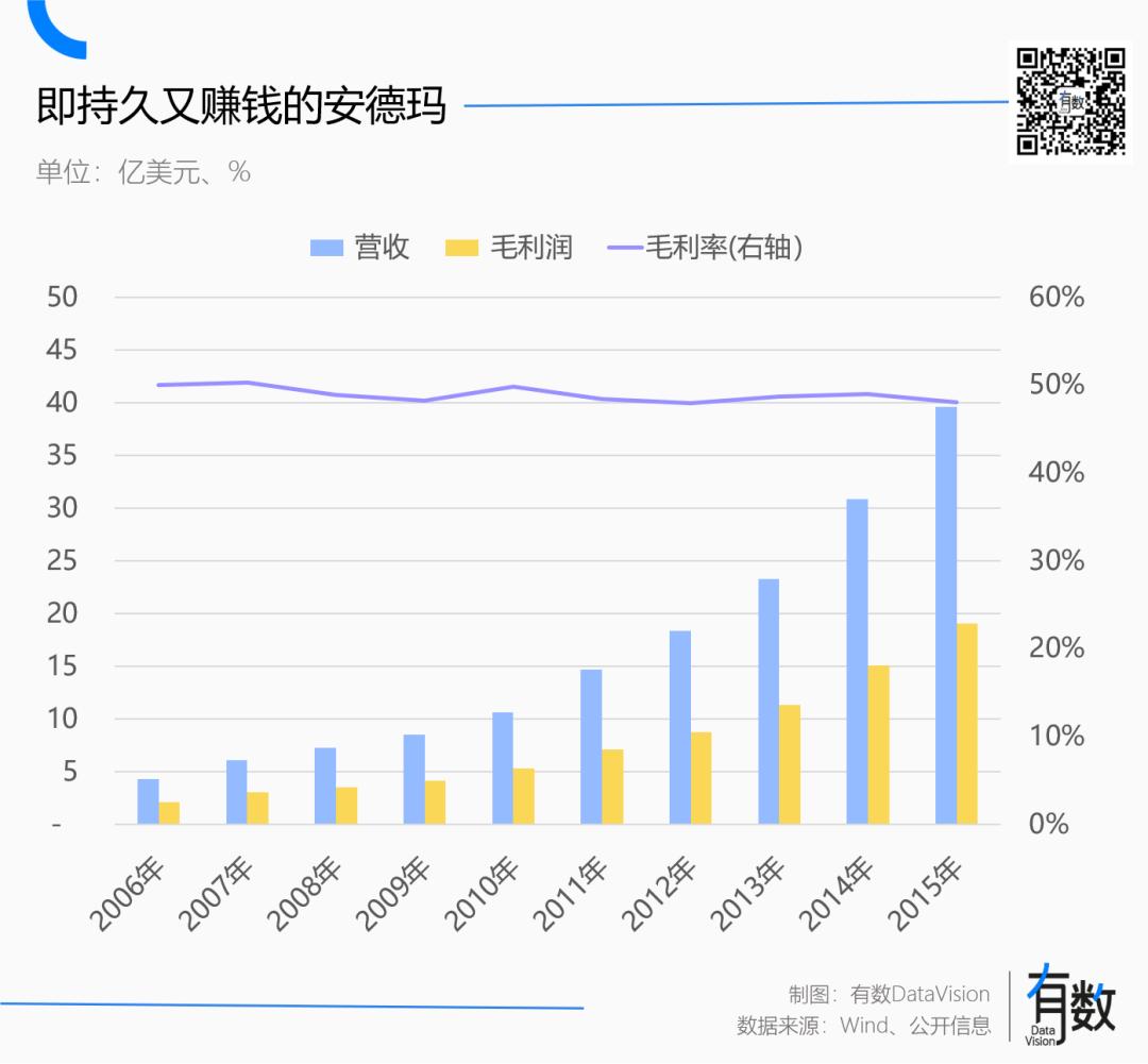 自1996年创立以来,安德玛营收增速连续19年维持20%以上,并在2015年以近40亿美元的销售额超越阿迪达斯,盈利能力也不逞多让,毛利率直逼50%[10]。
