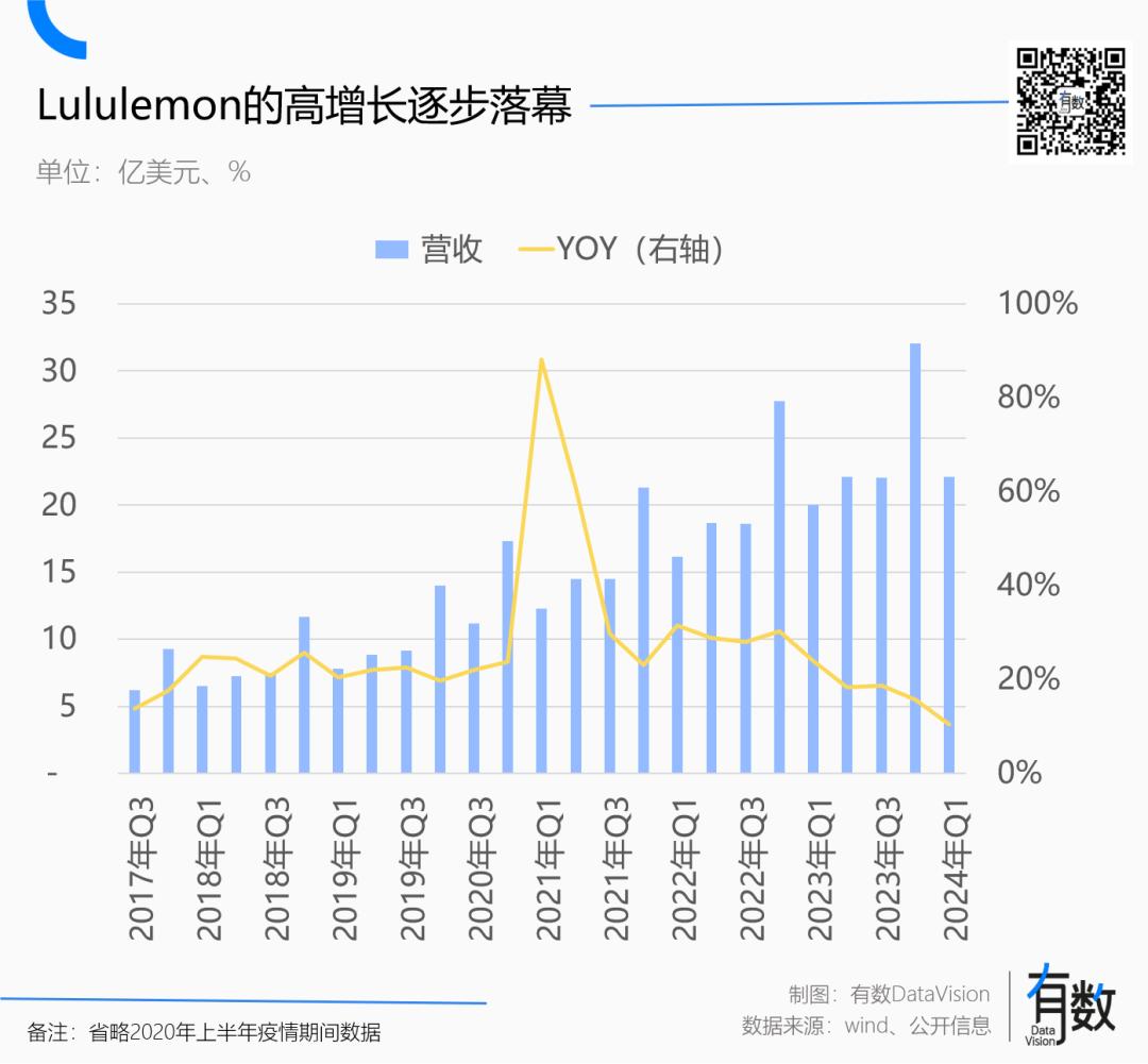 曾经,凭借前赴后继的“super girls”贡献订单,Lululemon上演了一场业绩增长神话:扣除2020年疫情关店影响,自2018年起,其收入同比增速连续19个季度保持在20%以上[4]。