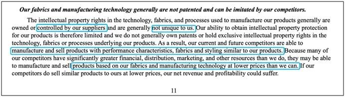 这种非独占模式,让Lululemon时刻处于风险丛林当中,儒鸿可以把面料卖给Lululemon,也可以卖给别人。