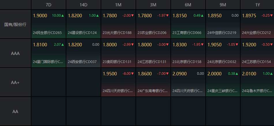 存单方面,今日3M期国股在1.77%-1.85%位置需求较好,较上一日下行1.97bp,1Y期国股报在1.89%-1.945%的位置,较前一日下行0.25bp。AAA级存单方面,9M成交在1.905%,1Y成交在1.92%的位置。