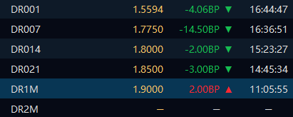 银银间市场回购定盘利率多数上涨,FDR001报1.6500%,持平上日;FDR007报1.8300%,较上日涨7.00个基点;FDR014报1.8600%,较上日涨4.00个基点。