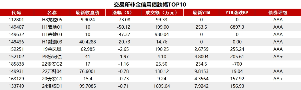 据Choice 数据统计显示,今日交易所市场非金信用债跌幅排行前五的分别是:H8龙控05、H1碧地01、H1碧地03、H1融创03、19金凤凰。具体如下: