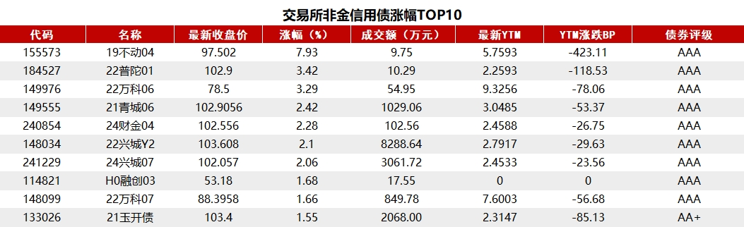 据Choice 数据统计显示,今日交易所市场非金信用债涨幅排行前五的分别是:19不动04、22普陀01、22万科06、21青城06、24财金04。具体如下: