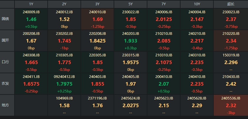 银行间主要利率债收益率多数下行,截至下午16:30,10年期国债活跃券240004收益率下行0.4bp报2.146%,30年期国债活跃券230023收益率下行0.75bp报2.37%,10年期国开活跃券240210收益率下行0.4bp报2.217%。