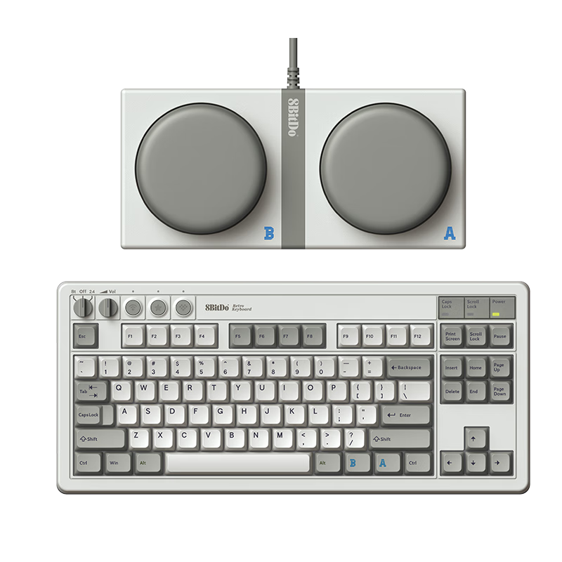 八位堂 Retro87 M 机械键盘采用灰白配色,支持蓝牙 / 2.4G / 有线三模连接,采用 Type-C 接口充电,IT之家附参数表如下: