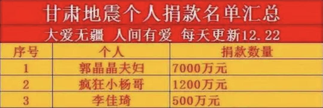 2023年甘肃地震,郭晶晶夫妇捐款7000万。