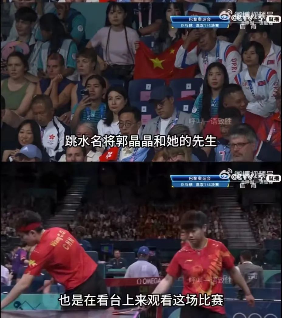 巴黎奥运会乒乓 球混双赛场,郭晶晶和先生霍启刚坐在观众席上,镜头扫到了他们,解说员自然地说道: