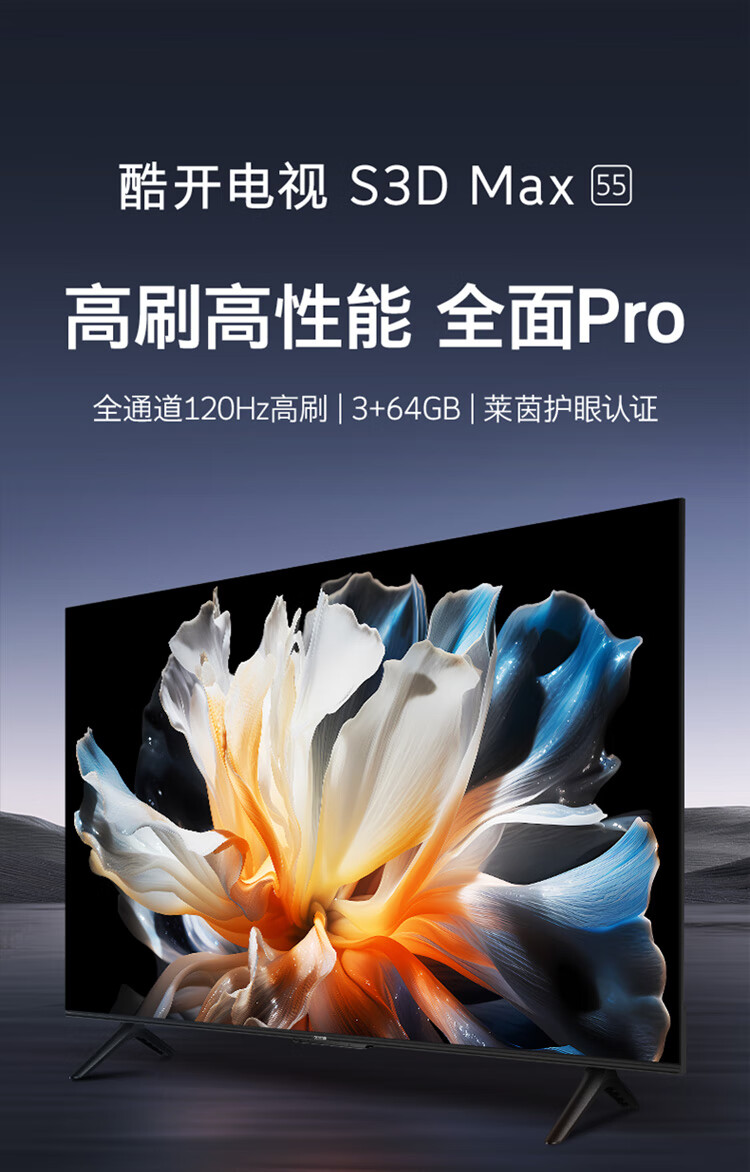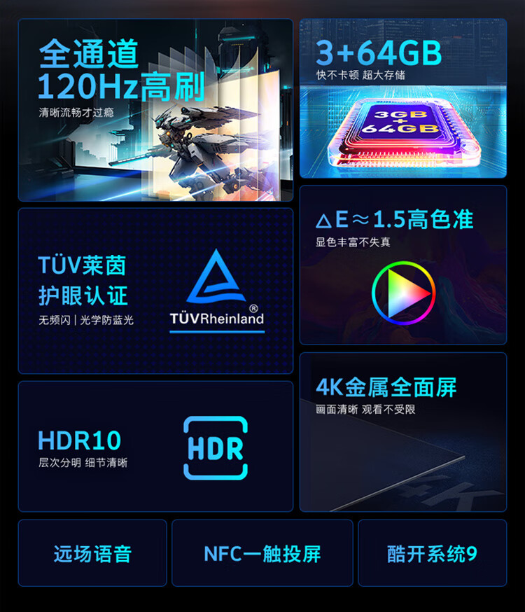 这款电视搭载四核处理器,配有 3GB+64GB 存储,支持 2.4/5GHz 双频段 Wi-Fi,配备 4K120Hz 屏幕,屏占比 99.5%,10.7 亿色,色准 ΔE≈1.5,通过莱茵护眼认证,提供 HDMI2.1 等接口,预装酷开系统 9 系,支持杜比解码 + DTS 音效。
