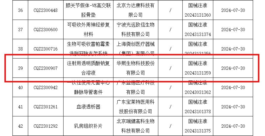昨日 (7月31日) ,据国家药品监督管理局 (以下简称:药监局) 官网信息显示,华熙生物科技股份有限公司 (以下简称:华熙生物) 申报的“注射用透明质酸钠复合溶液”于2024年7月30日正式获批,注册证编号:国械注准20243131359,产品主要适用于纠正颈部中重度皱纹。