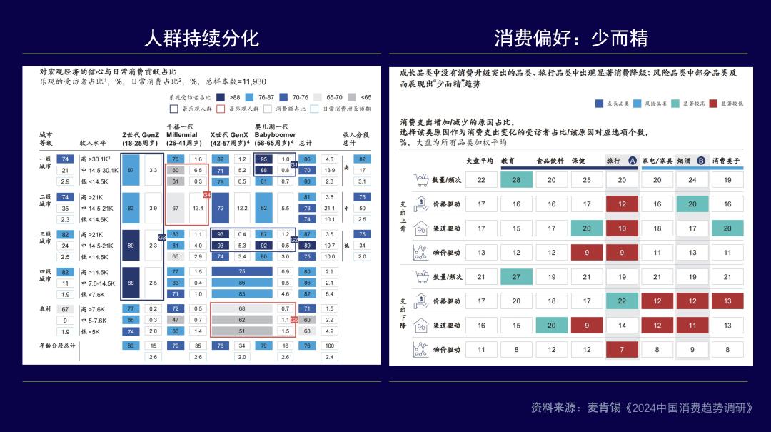 从麦肯锡这个调研中,能看到人群的代际、城市、消费信心、需求品类,都是更分散的。