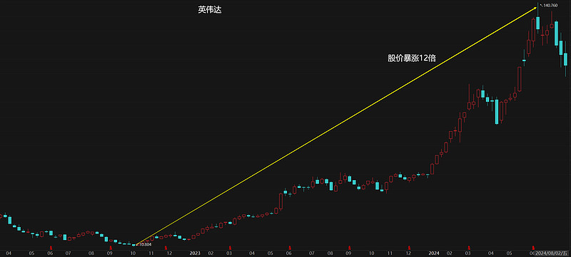 站在风口上猪都能上天,而英伟达恰好就是当前的那只飞天神猪。股价从10.8一路飙升到140.76,暴涨12倍。