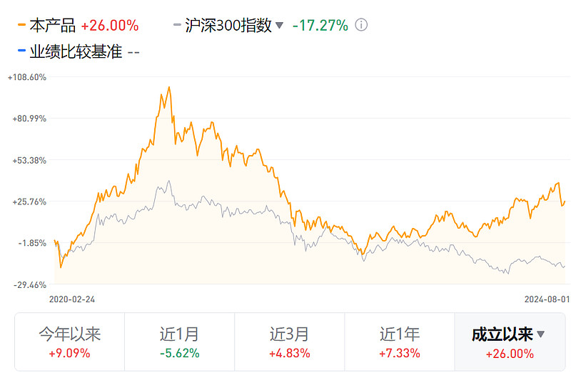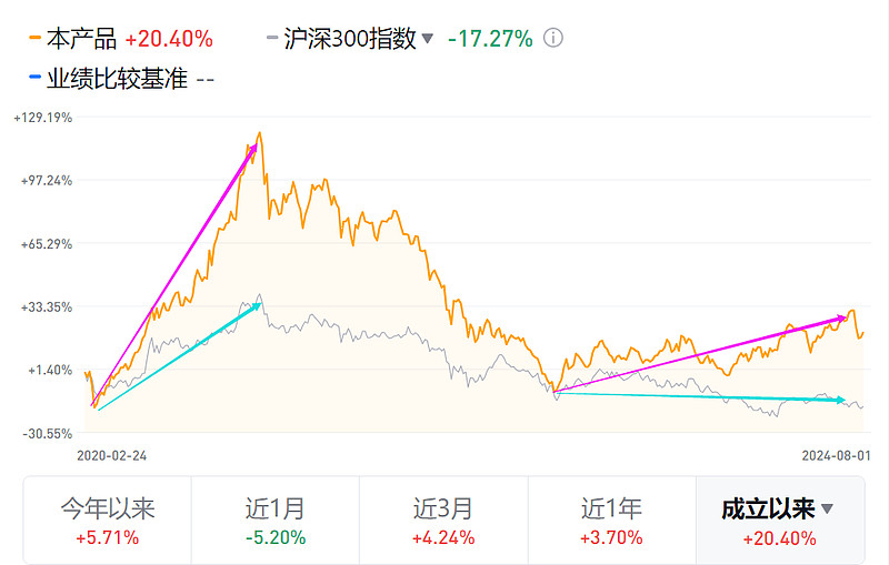 成立以来,经历了一轮完整的大熊市,截止目前这只产品仍取得了20.4%的正收益,同期沪深300则下跌17.27%。