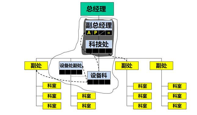 举个例子,大家对照上面这张客户组织结构图作参考。蓝色框定的部分是这一次参与采购的主要的决策者。所以我们要搞清楚,副总管什么、话语权有多大。副总下面是科技处,科技处下面有一个技术处的副处长,再下面还有设备处、设备科。