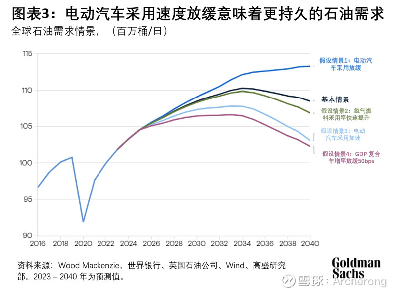 高盛研究部的基本预测是,石油需求到2034年将达到每天1.1亿桶的峰值。如若电动汽车普及速度放缓,石油需求可能会继续增长至2040年,达到每天1.13亿桶。