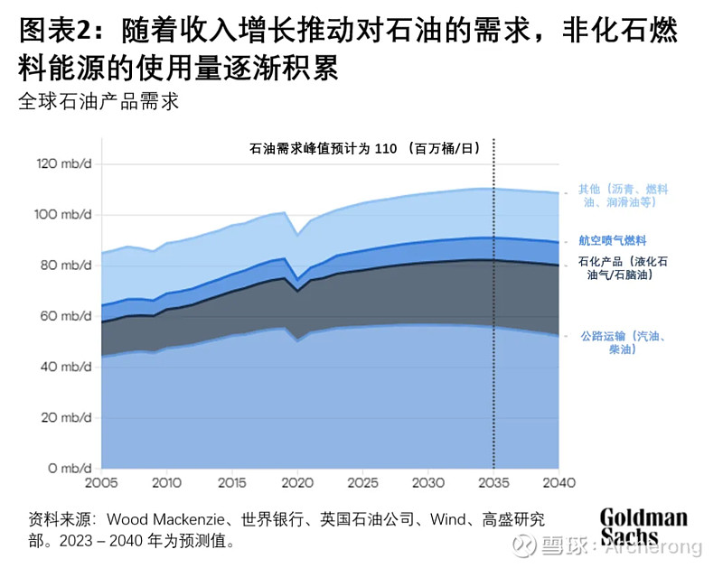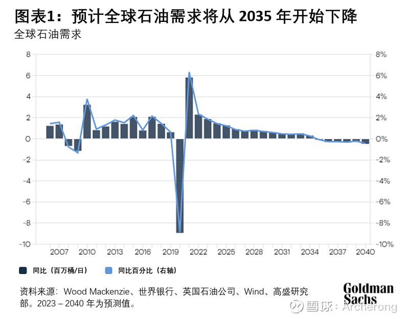 高盛研究部预测全球石油需求将在2034年左右达到峰值,随后以年复合增长率0.3%的幅度温和下降至2040年。中国对石油的需求将于2020年代末达到峰值。