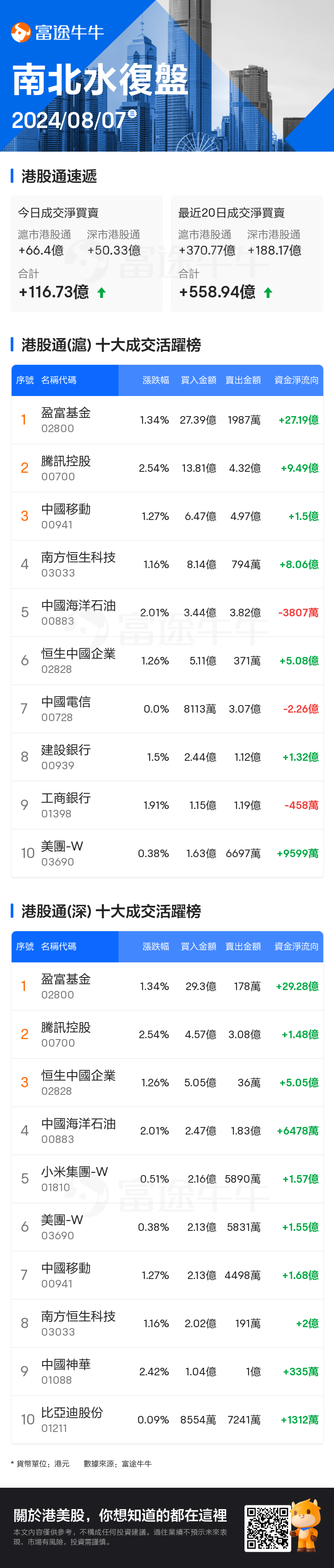 8月7日(周三),南下资金净买入港股116.73亿港元。